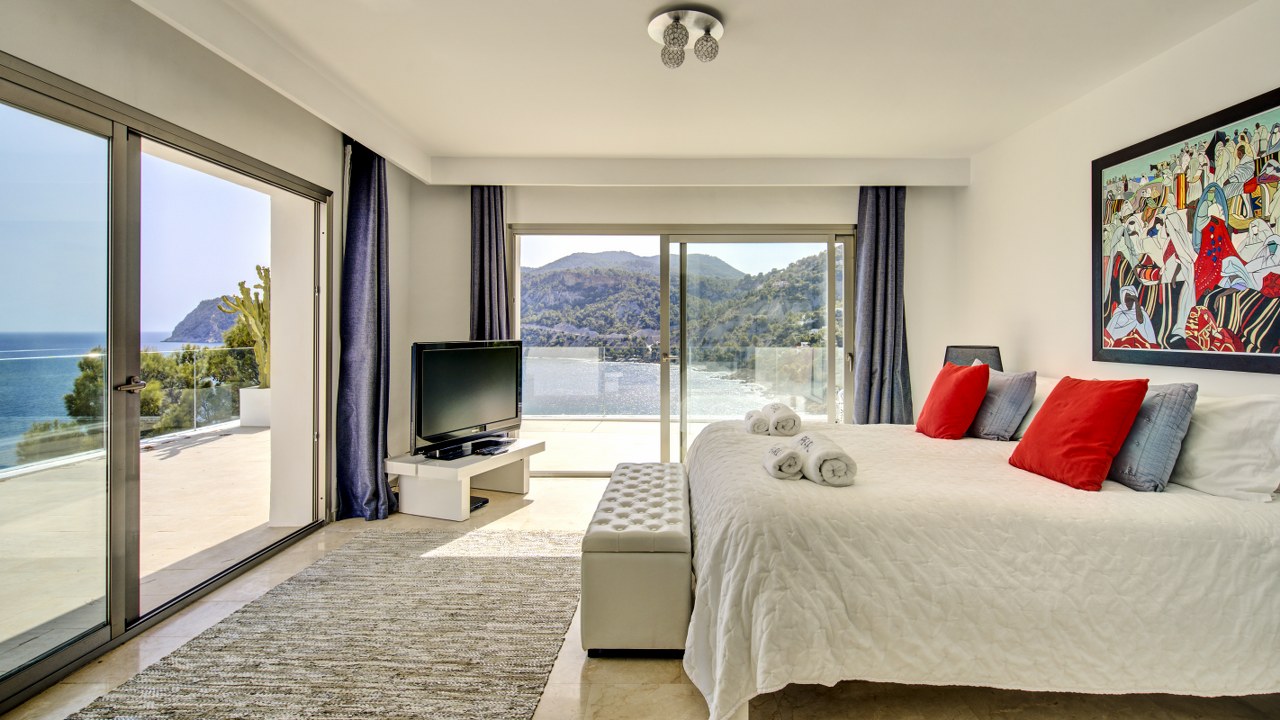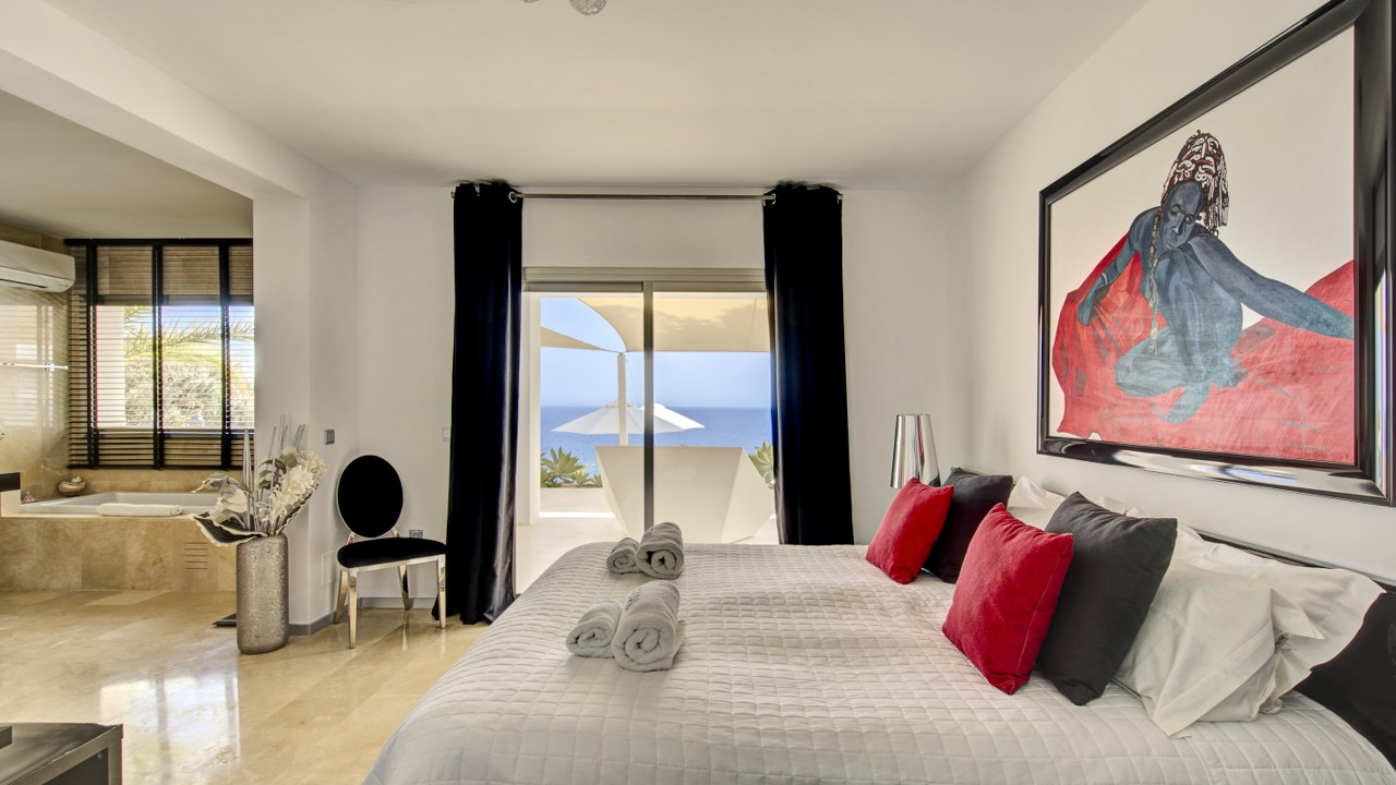 The impressive master suite occupies the first floor, offering 40 m² of space, a Jacuzzi bathtub, private entrance, and uninterrupted sea views.