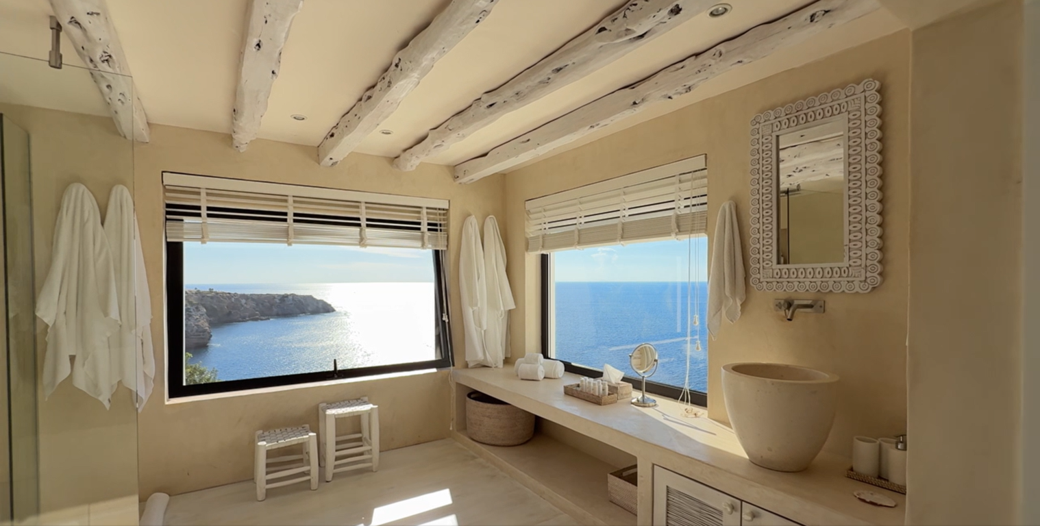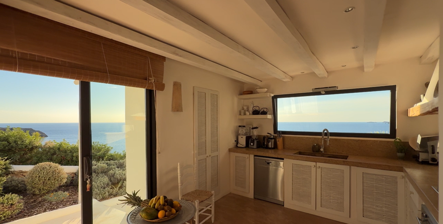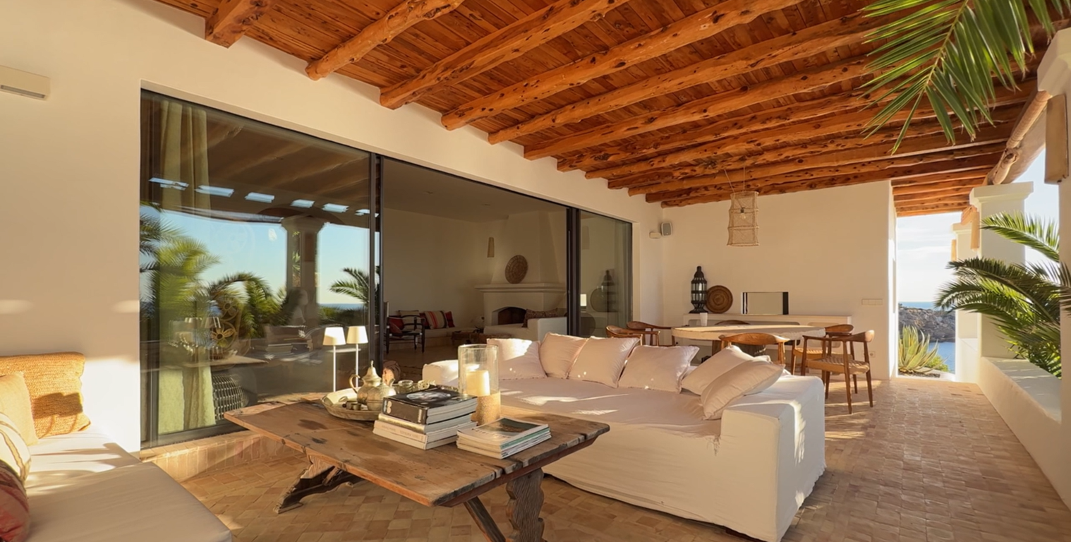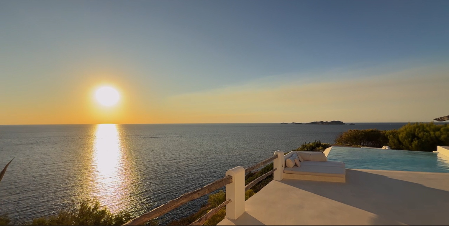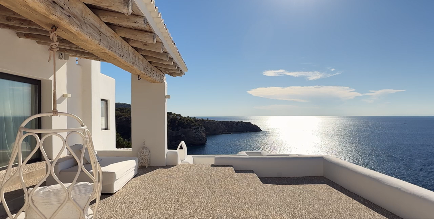 Sa Cova is a luxury villa of rare beauty, front-line and directly on the seafront, enhanced by uninterrupted panoramic views over the Mediterranean and its most spectacular sunsets. Located in the prestigious Cala Moli, it enjoys an exceptionally private yet strategic position: just 10 minutes from San Josep and 25 minutes from Ibiza.