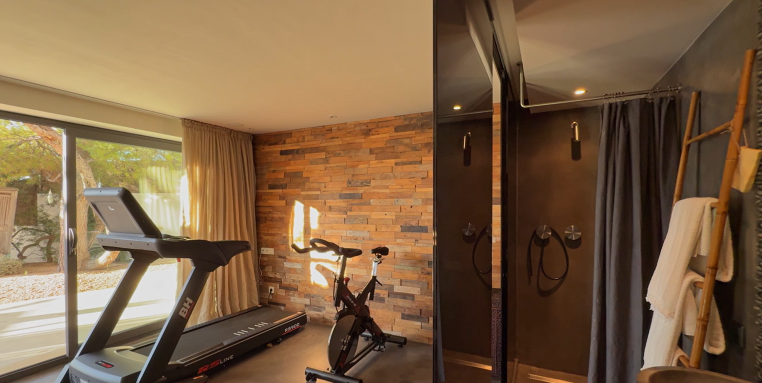 1 private gym equipped with treadmill, fitness machines and bathroom with shower