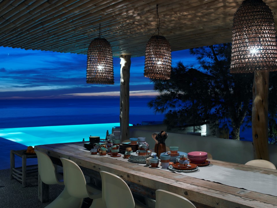 Pergola adjacent to the pool with a dining table for 14 guests, ideal for exclusive entertaining and high-end gatherings.