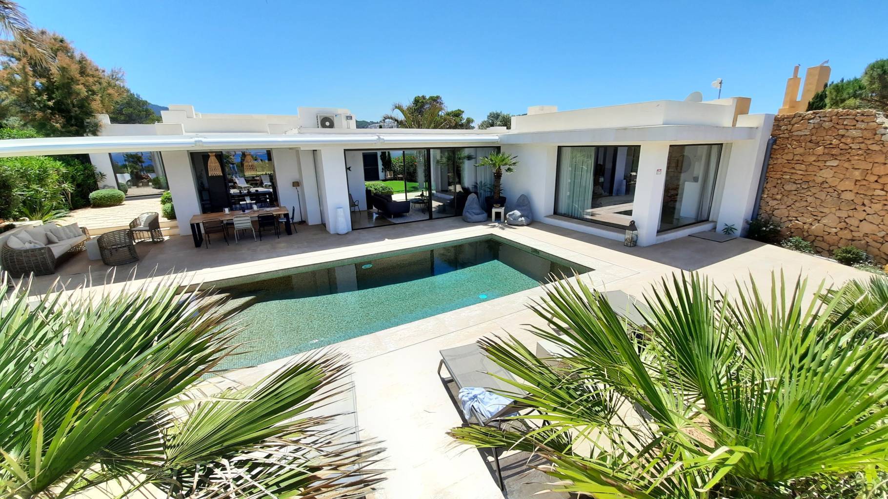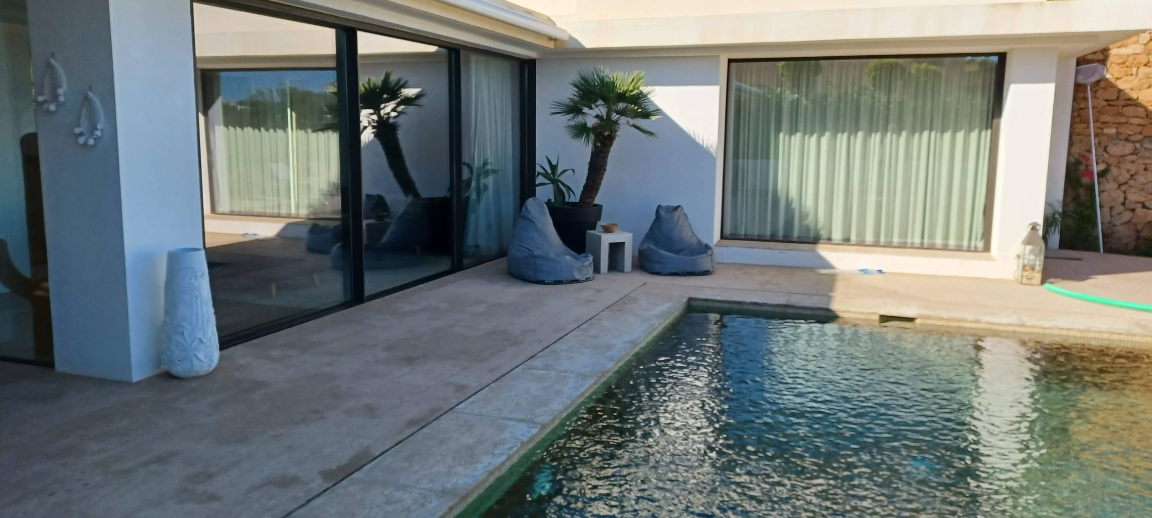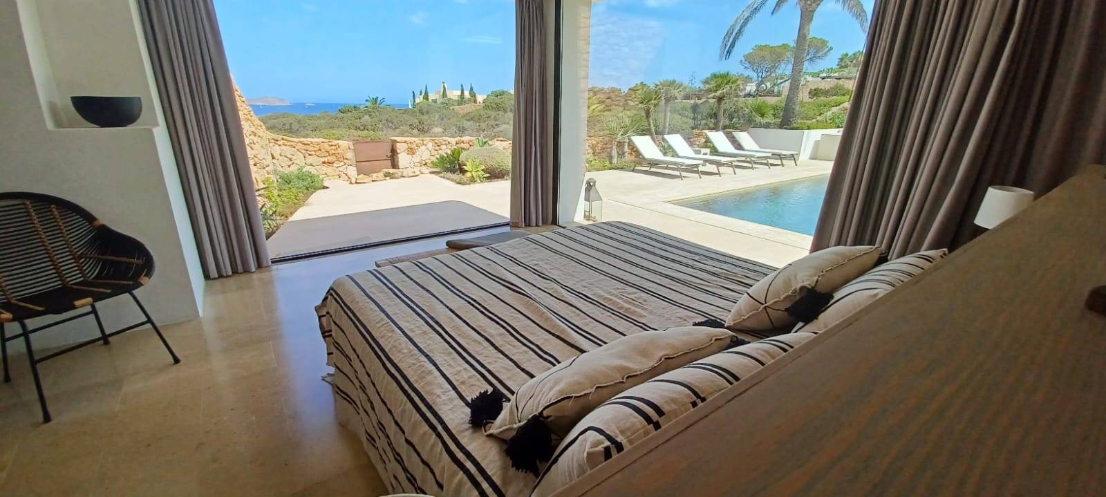 The outdoor areas are designed for elevated living: a beautiful swimming pool (9 x 4 m), multiple lounge spaces, and a covered dining porch facing the sea and the S’Esparta islands—perfect for long, relaxed meals and unforgettable evenings under the Ibizan sky.