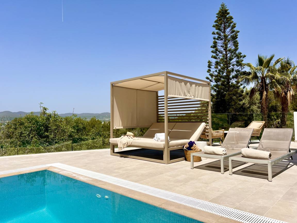The swimming pool and expansive wrap-around terrace enjoy enchanting views over Ibiza Town, creating the perfect setting for unwinding on long summer days. Sun loungers, parasols and comfortable daybeds allow guests to choose their ideal spot to relax.