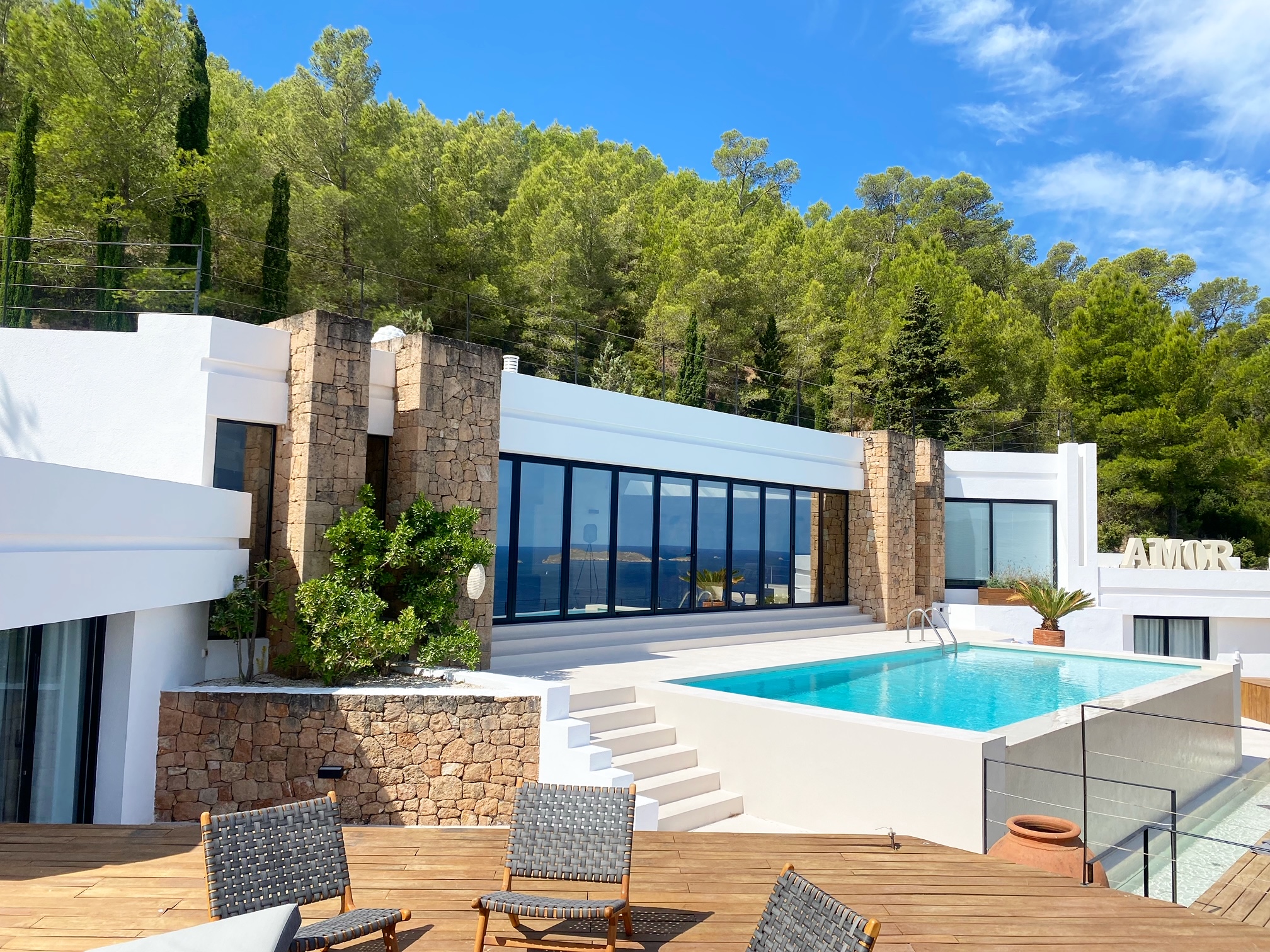 Villa Vadella is a charming property set on a private 10,000 m² plot, overlooking the stunning areas of Ibiza’s west coast, between the beaches of Cala Vadella and Cala Carbo. Ideal for holiday rentals aimed at families and couples seeking comfort, privacy and tranquillity, the villa offers wide panoramic sea views from almost every side. The distinctive wooden bridge rises above the surrounding greenery and opens up to a breathtaking cliffside view, providing one of the island’s most spectacular sunset settings.