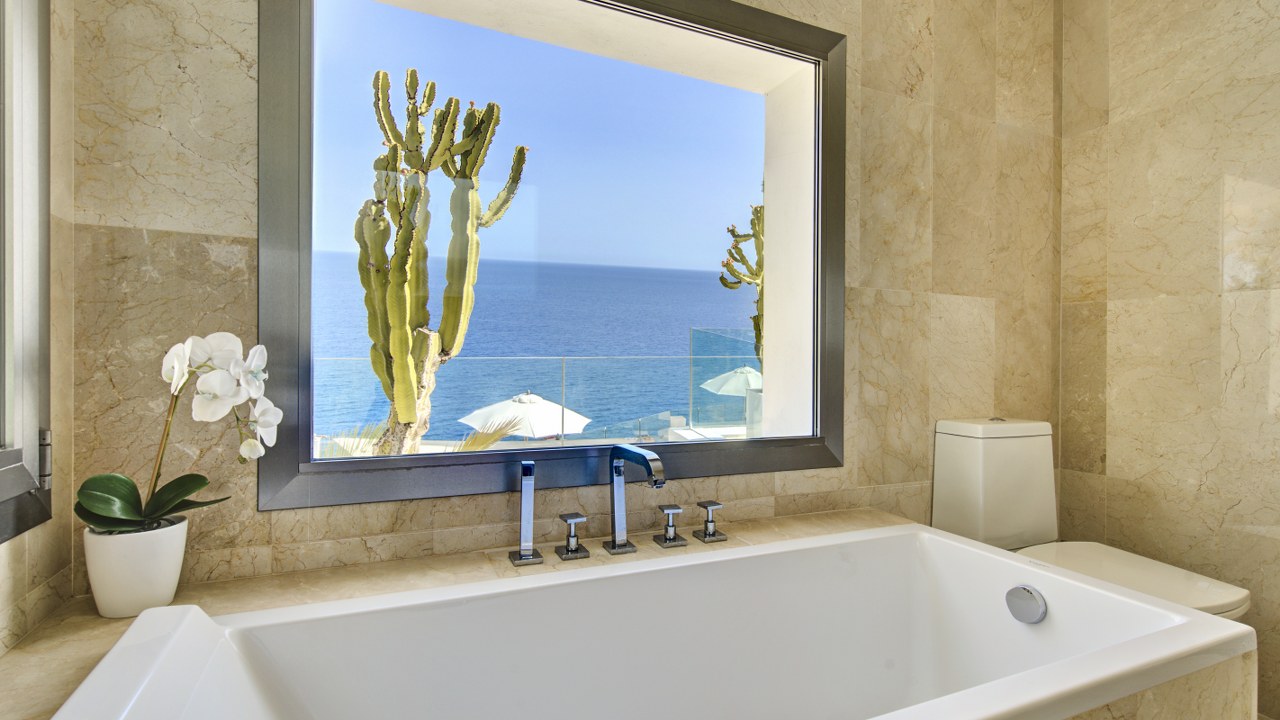 La magnifica suite padronale occupa il primo piano e offre 40 m² di superficie, una vasca Jacuzzi, ingresso privato e una vista mare ininterrotta.