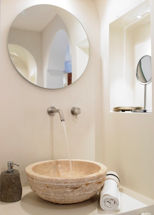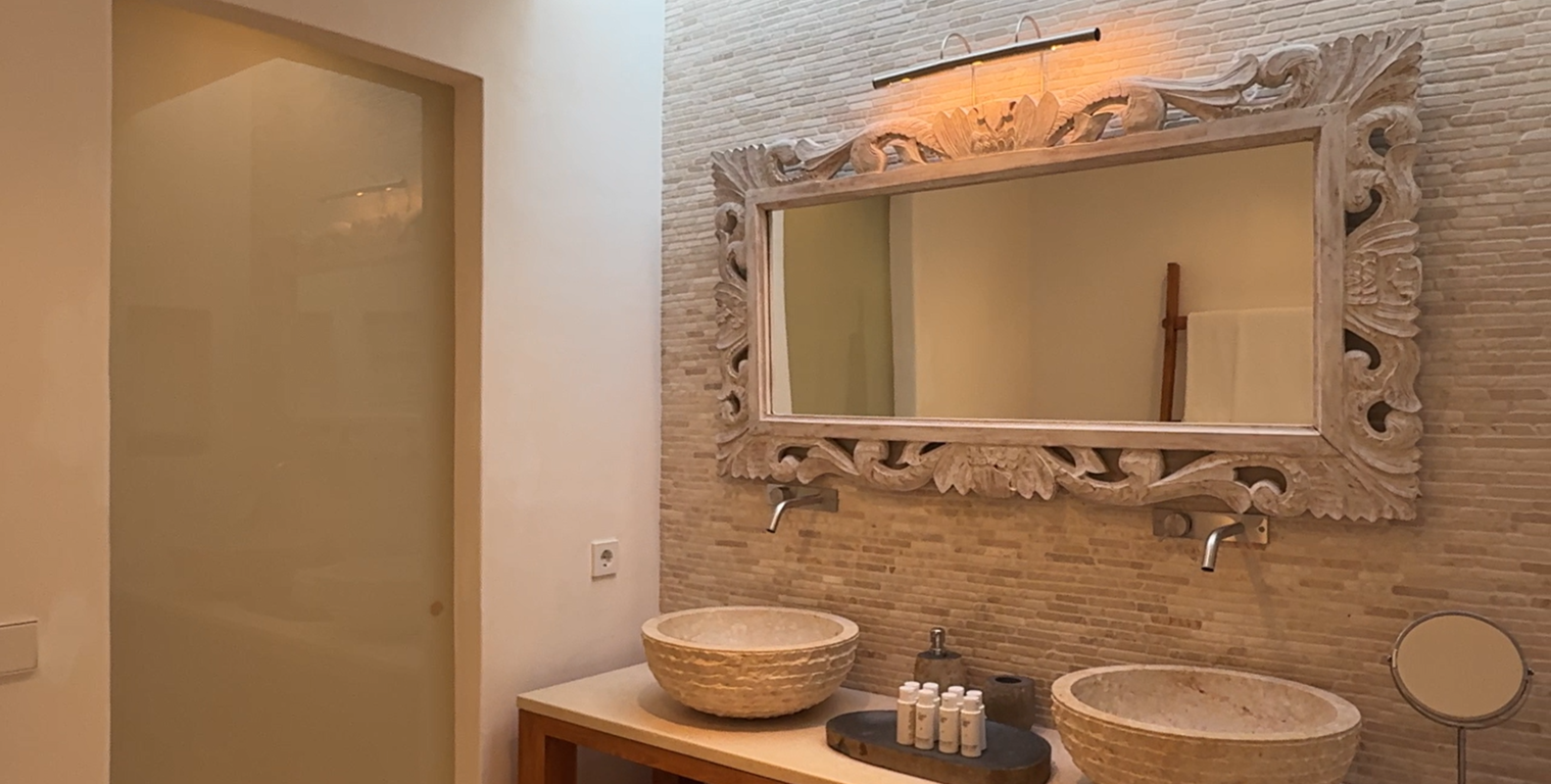 Tutti i bagni sono rifiniti con docce o vasche in pietra di Bali e rubinetteria di design.