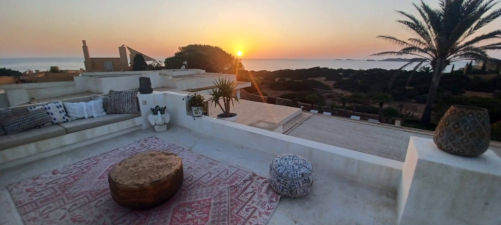 Uno degli elementi più affascinanti della villa è la terrazza panoramica sul tetto. Da qui è possibile godersi un aperitivo al tramonto, con una vista privilegiata sul sole che si tuffa nel mare e sulla silhouette magica di Es Vedrà all’orizzonte—uno scenario iconico e suggestivo.