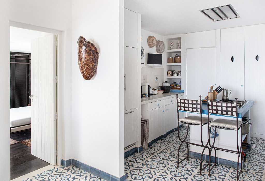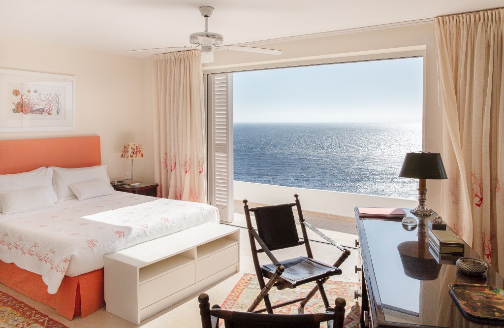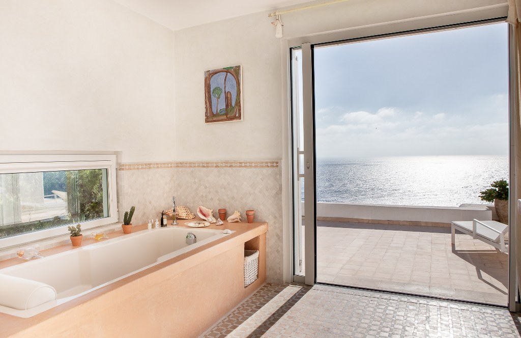 1 amplia suite con cama de 180×200 cm, TV satélite y baño completo con ducha italiana y bañera, abierta a una gran terraza frente al mar, perfecta para disfrutar de la brisa marina y el paisaje.
