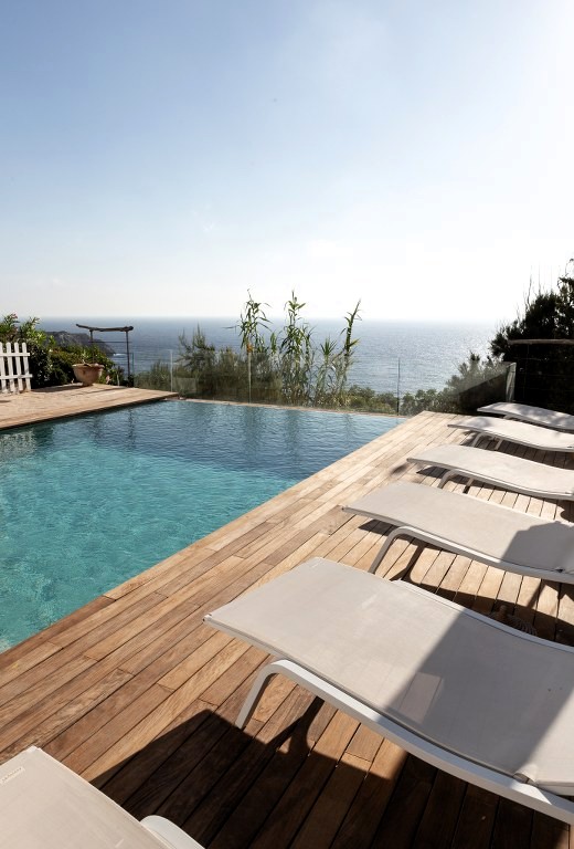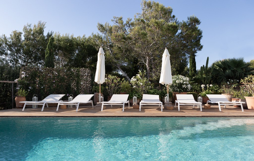 Amplia terraza con piscina privada de 10 x 5 m, zona de salón y comedor exteriores con barbacoa, desde donde se disfrutan impresionantes vistas a las islas S’Espartas, Bledas y a inolvidables puestas de sol.