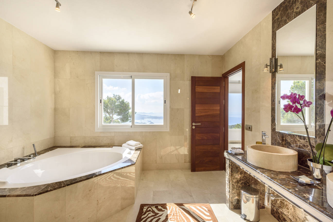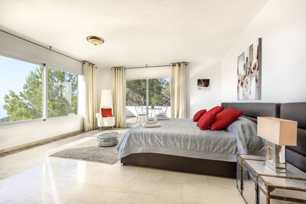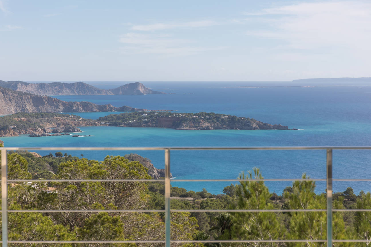 La villa destaca por su amplia terraza panorámica con piscina privada de 9 x 4 metros, desde la cual se disfrutan impresionantes vistas a Las Salinas, Cala Jondal y a la fascinante isla de Formentera.