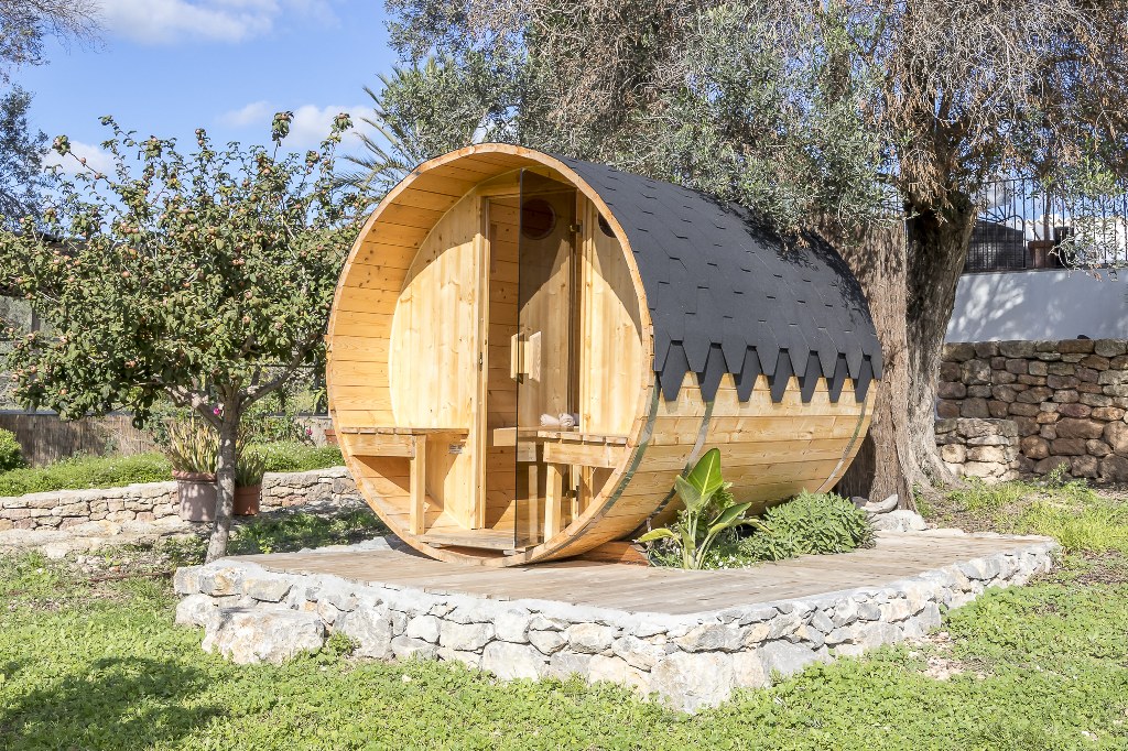 El exterior de la villa es un auténtico sueño y representa uno de sus mayores atractivos. Los amplios espacios exteriores, inmersos en la naturaleza y perfectamente equipados, ofrecen el escenario ideal para disfrutar de unas vacaciones exclusivas o para organizar eventos privados y encuentros sociales de alto nivel. Además de la paz y el silencio que caracterizan a Can Skye, el jardín cuenta con sauna, un espacio dedicado a yoga y gimnasio y una pequeña discoteca rústica, perfecta para veladas privadas.