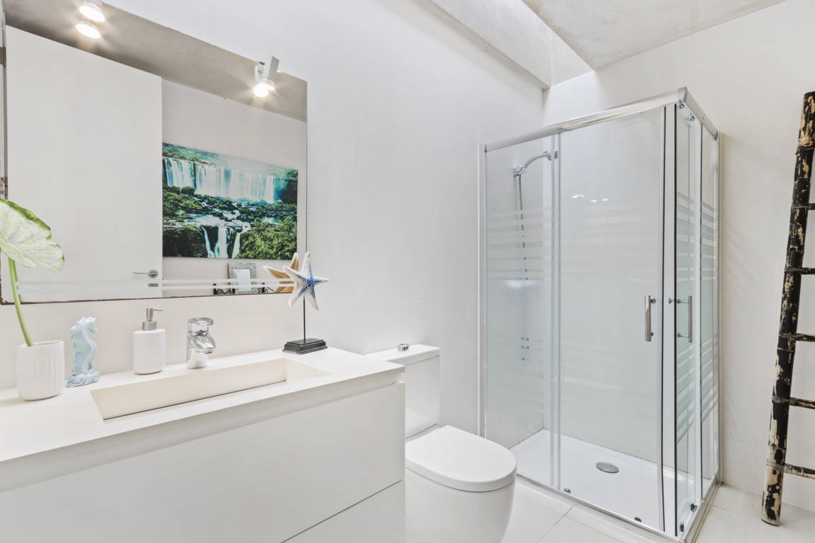 1 dormitorio principal ubicado en la planta superior con una encantadora vista al mar que se extiende hasta Formentera. Este dormitorio cuenta con una amplia terraza privada con hamacas y acceso directo a la piscina. El espacio es luminoso y muy amplio, y dispone de una cama doble y un elegante baño con ducha.