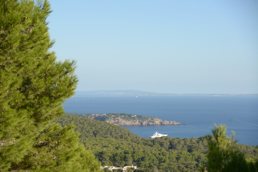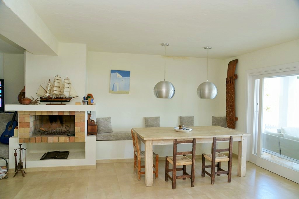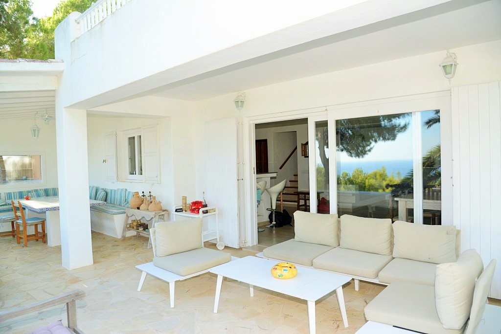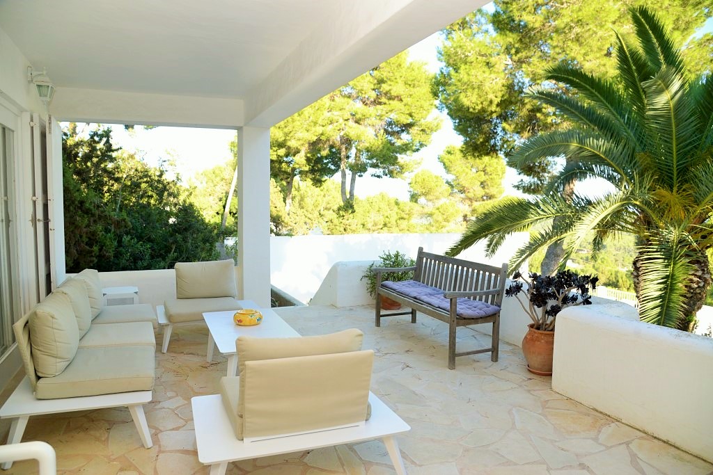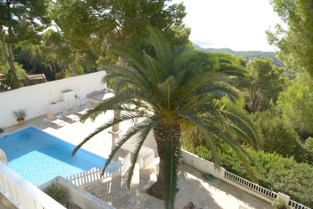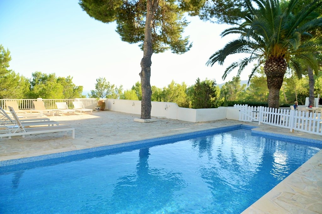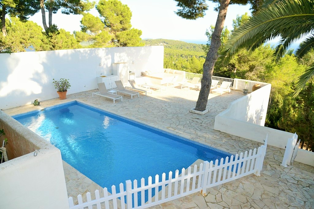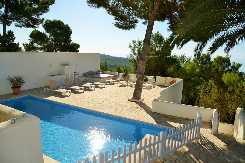 La propiedad cuenta con una impresionante terraza con piscina de 9 x 4 m, elegantemente rodeada de tumbonas, con vistas panorámicas sobre la bahía de Es Cubells y Formentera.