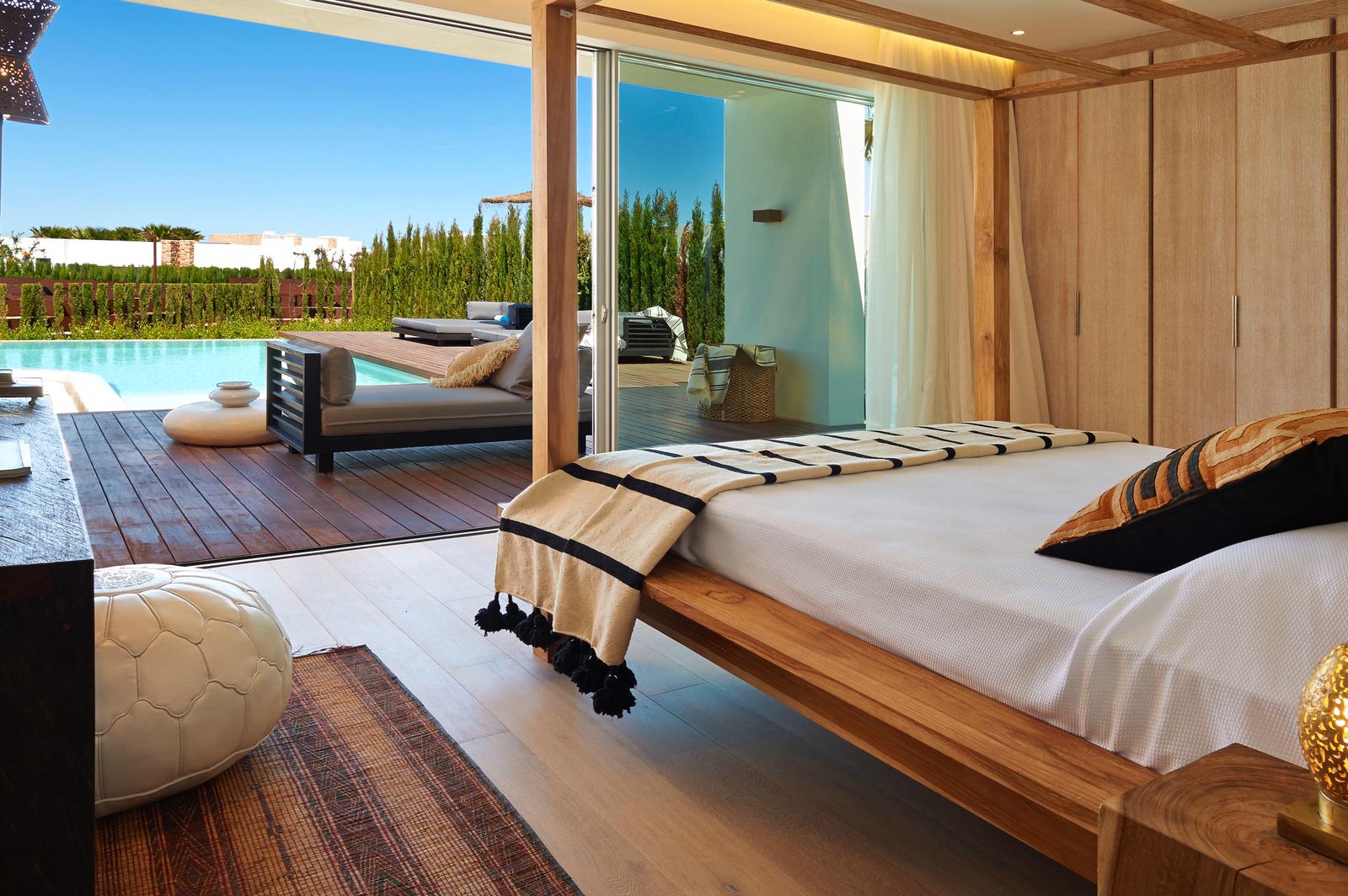 4 dormitorios dobles de lujo con camas King Size para hasta 8 huéspedes, todos situados en la planta baja; uno de ellos con dos camas individuales separables, todos con acceso directo a los jardines de la villa